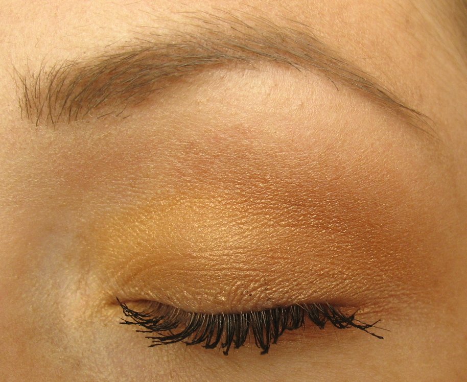 For my eyes I used Bare Escentuals Kiko on the inner eye and Bare Escentuals Fantasy on the outter eye and crease. Kiko is a shimmery gold yellow. It looks even more yellow in real life in the pot but on the eye it really shows up a very pretty golden color. Fantasy is a gorgeous shimmery copper color that has golden and rose undertones. Both of these colors were purchased at the BE outlet store, Fantasy as an individual full size and Kiko as a mini in a four-piece eye shadow set. I'm not sure how easily these can be found since they're not sold in normal BE boutiques but you might be able to find them online or at an outlet if you're lucky enough to live close to one.